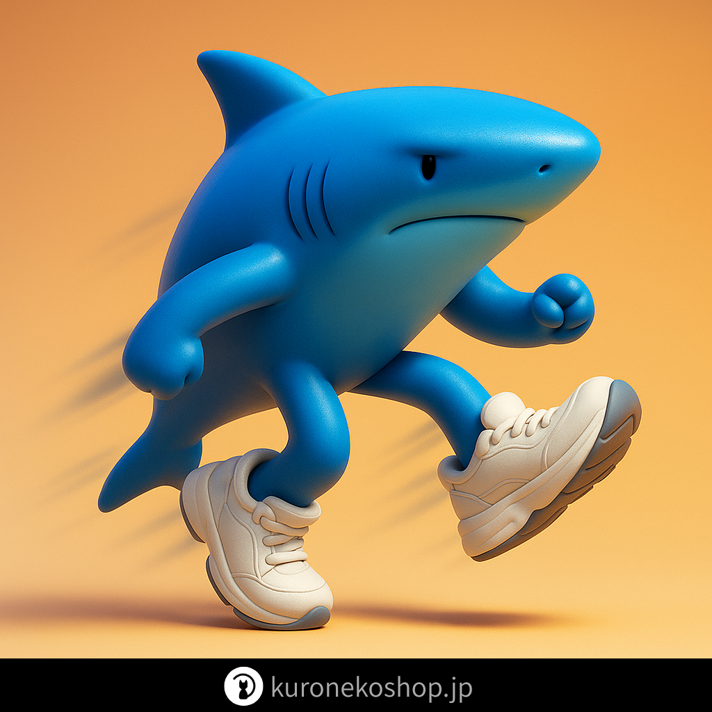 サメ+Nikeスニーカー | 三本脚の青いサメ。スニーカーで踊りまくる“元祖”的アイコン。無表情・高速ランのイメージ |